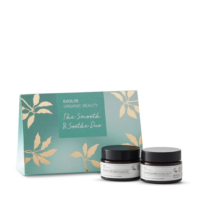 Le coffret soin The Smooth & Soothe Duo EVOLVE exfolie délicatement la peau et l’hydrate en profondeur.