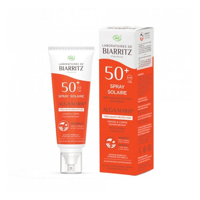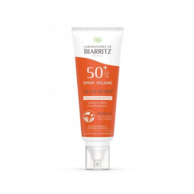 La crème solaire bio en spray Alga Maris LABORATOIRES DE BIARRITZ présente une protection maximale SPF50 pour protéger efficacement les peaux les plus claires.