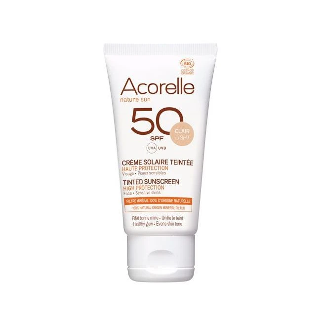 La crème solaire teintée SPF50 ACORELLE est parfaite pour les peaux sensibles. Elle protège, unifie et illumine la peau grâce à la poudre de mica, réflecteur de lumière.