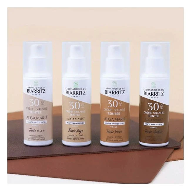 La crème solaire teintée bio SPF30 Alga Maris LABORATOIRES DE BIARRITZ offre une excellente protection à la peau contre les UVA et UVB.