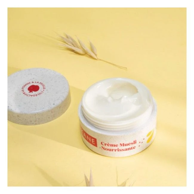 La crème visage bio au Muesli AKANE nourrit en profondeur les peaux sèches grâce à une formule riche en huiles et beurres végétaux.Tel un petit déjeuner copieux, offrez à votre épiderme les nutriments essentiels dont elle a besoin : les huiles de son d’avoine, de sésame et le beurre de cacao nourrissent en profondeur pour rendre la peau plus souple, rebondie, en pleine santé ! Elle est également parfaitement protégée des radicaux libres et des agressions extérieures, comme la pollution ou le froid.