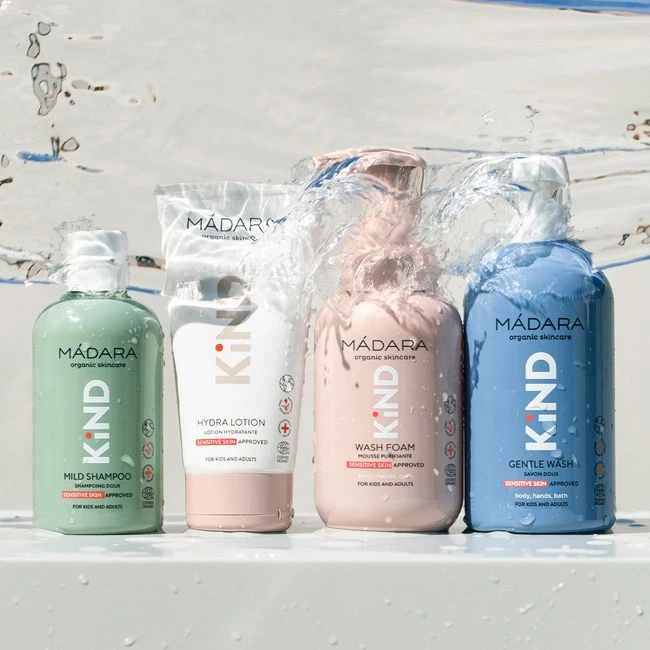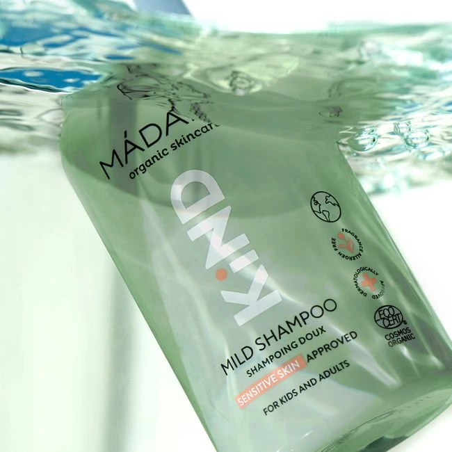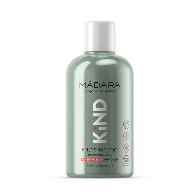 Le shampoing ultra doux Kind MADARA nettoie les cheveux et le cuir chevelu en douceur.